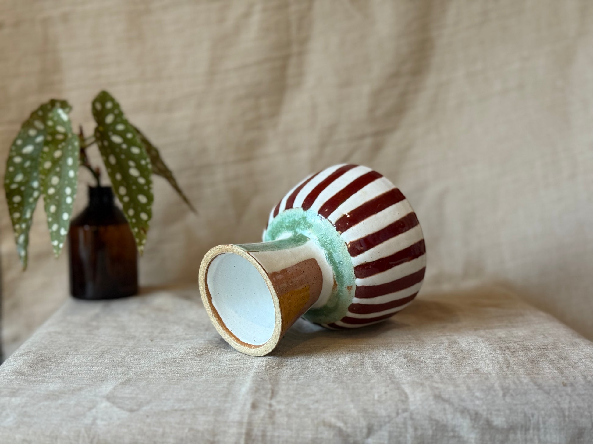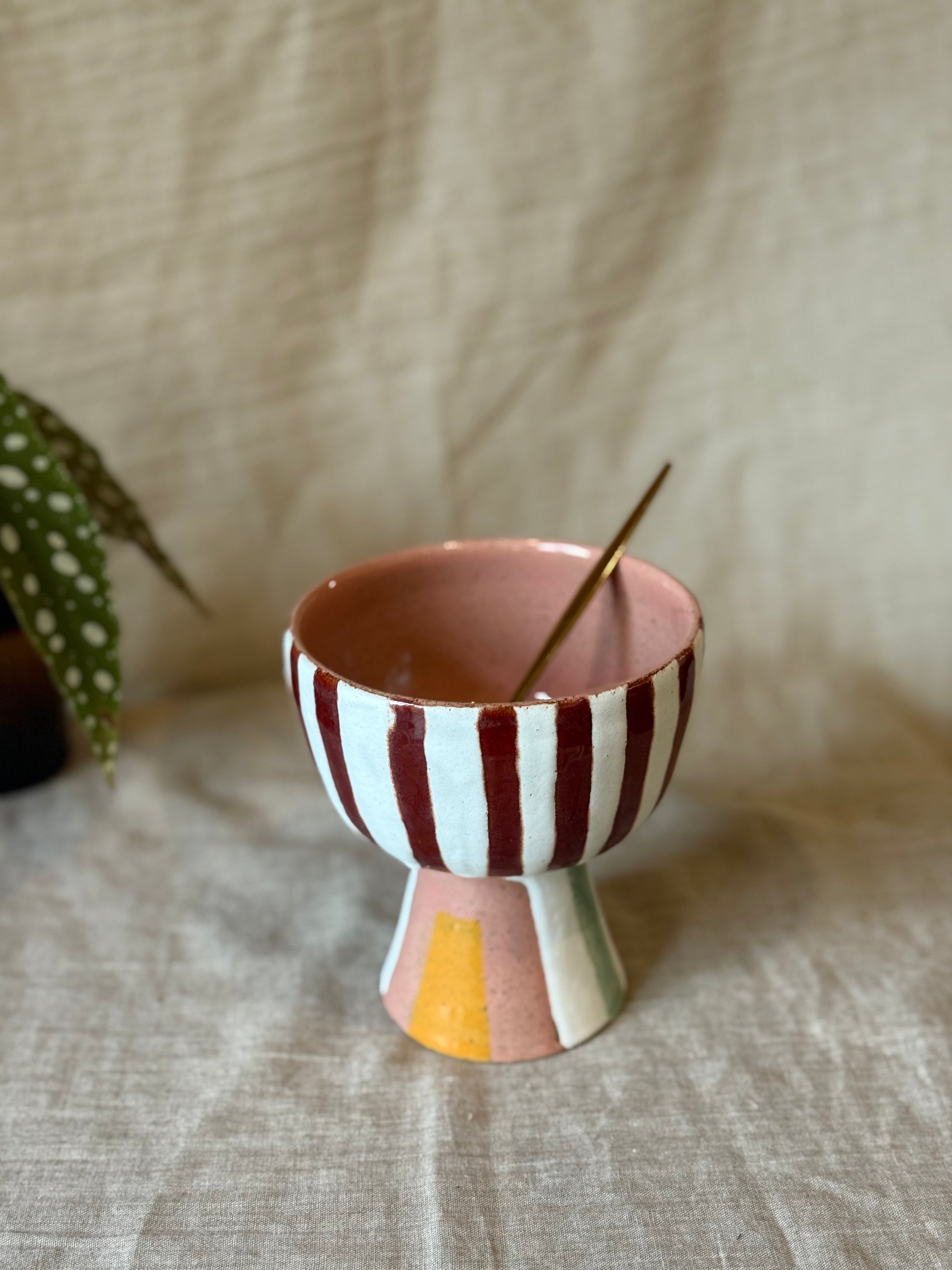 A striped pedestal bowl in warm terracotta and peppermint tones reminiscent of festive Humbug sweets. A quirky little display bowl perfect for snacks, dessert or statement styling.